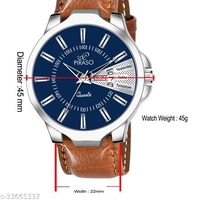Brand- PIRASO , Strap Material: LeatherCase/Bezel Material: Stainless SteelClasp Type: BuckleDate Display: YesDial Design: Brand LogoDial Shape: RoundDisplay Type: AnalogDual Time: NoGps: NoMechanism: QuartzPower Source: Battery PoweredScratch Resistant: YesShock Resistance: NoWater Resistance: YesPIRASO IS A UNIQUE BRAND THAT MAKES YOUR PERSONALITY GRAND.PIRASO presenting a new Trendy watch with one of the best quality. we give this watch with A-Grade quality of movement and battery which help you to run the watch for long time .Sizes: Free Size (Dial Diameter Size: 45 mm) Country of Origin: India